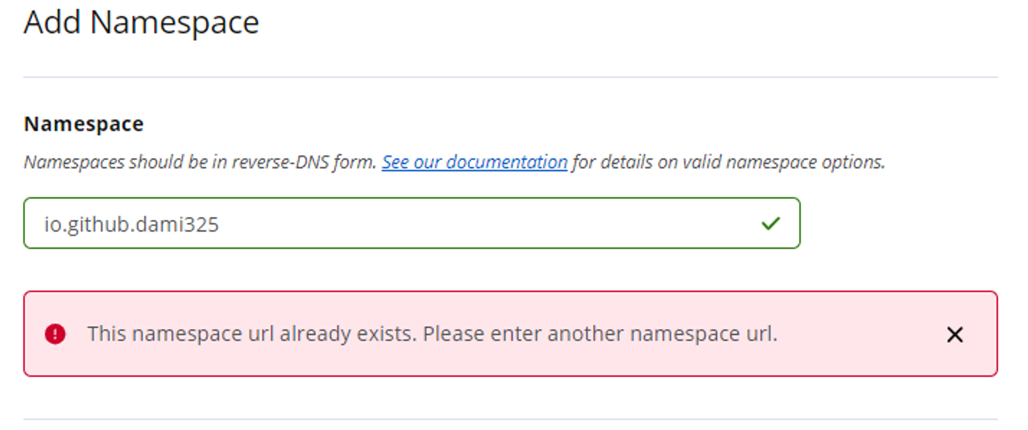 참고로 2024년 3월 12일 전에 기존 OSSRH를 사용하던 방식으로 도메인을 등록한 경우에는 Namespace를 새로 등록해 주지 않고 AddNamespace를 통해 등록 하려 해도 아래와 같은 오류를 보게 됩니다.
