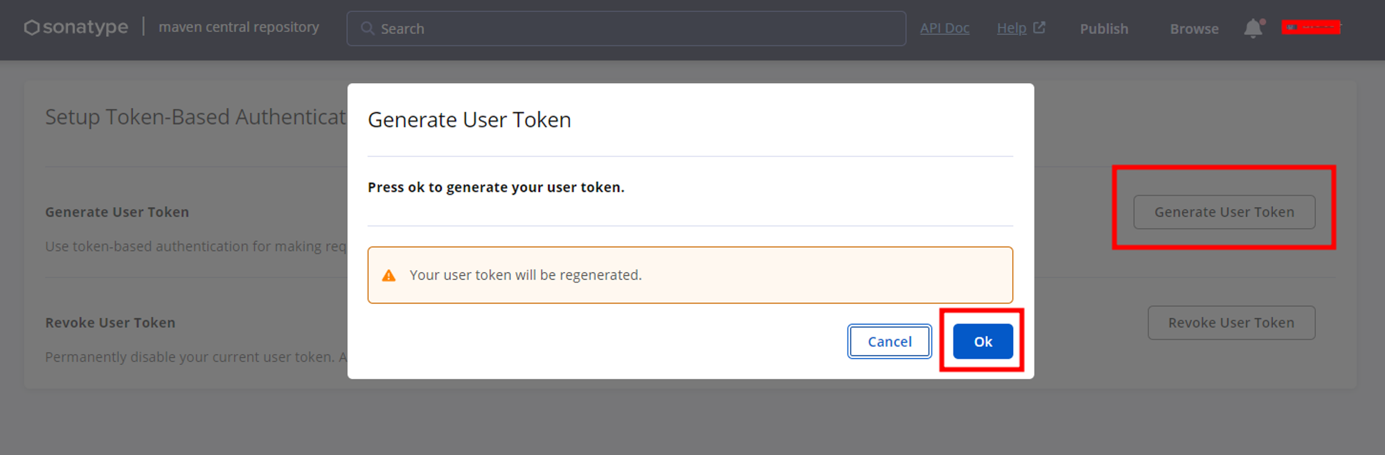 mavenCentralUsername , mavenCentralPassword 설정 정보는 사이트의 View Account → Generate User Token → Ok 를 누르면 나오는 username 과 password 를 각각 작성하시면 됩니다. 참고로 설명드리면 유효기간이 있고 Ok를 누를 때마다 발급되는 토큰이라 배포 시 계속 바뀌는 정보입니다.