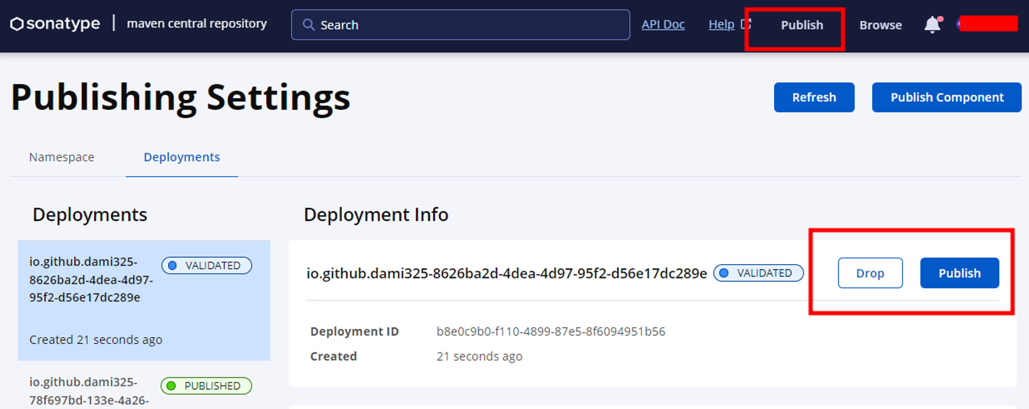 배포명령어가 성공적으로 이루어졌다면 사이트의 Deployments를 확인해 보면 Drop 과 publish가 활성화된 것을 볼 수 있습니다. 잘못 배포한 경우 Drop을 눌러 지워주시면 되고 Publish 버튼을 눌러 라이브러리 발행을 계속 진행합니다.